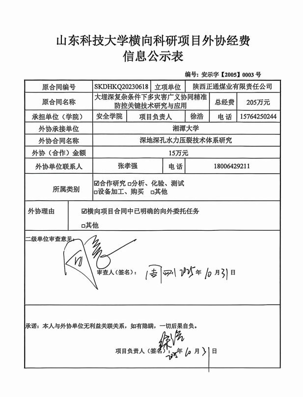 根据《山东省人民政府办公厅印发关于进一步完善财政科研项目资金管理的若干措施的通知》(鲁政办字〔2019〕120号)以及《山东科技大学横向科研项目与经费管理办法(试行)》(山科大发〔2020〕64号)相关规定,现对 徐浩 为项目负责人的 大埋深复杂条件下多灾害广义协同精准防控关键技术研究与应用 项目的外协经费情况进行公示,公示时间为 2025年11月03日-2025年11月09日(五个工作日)。在公示期间,未有异议。