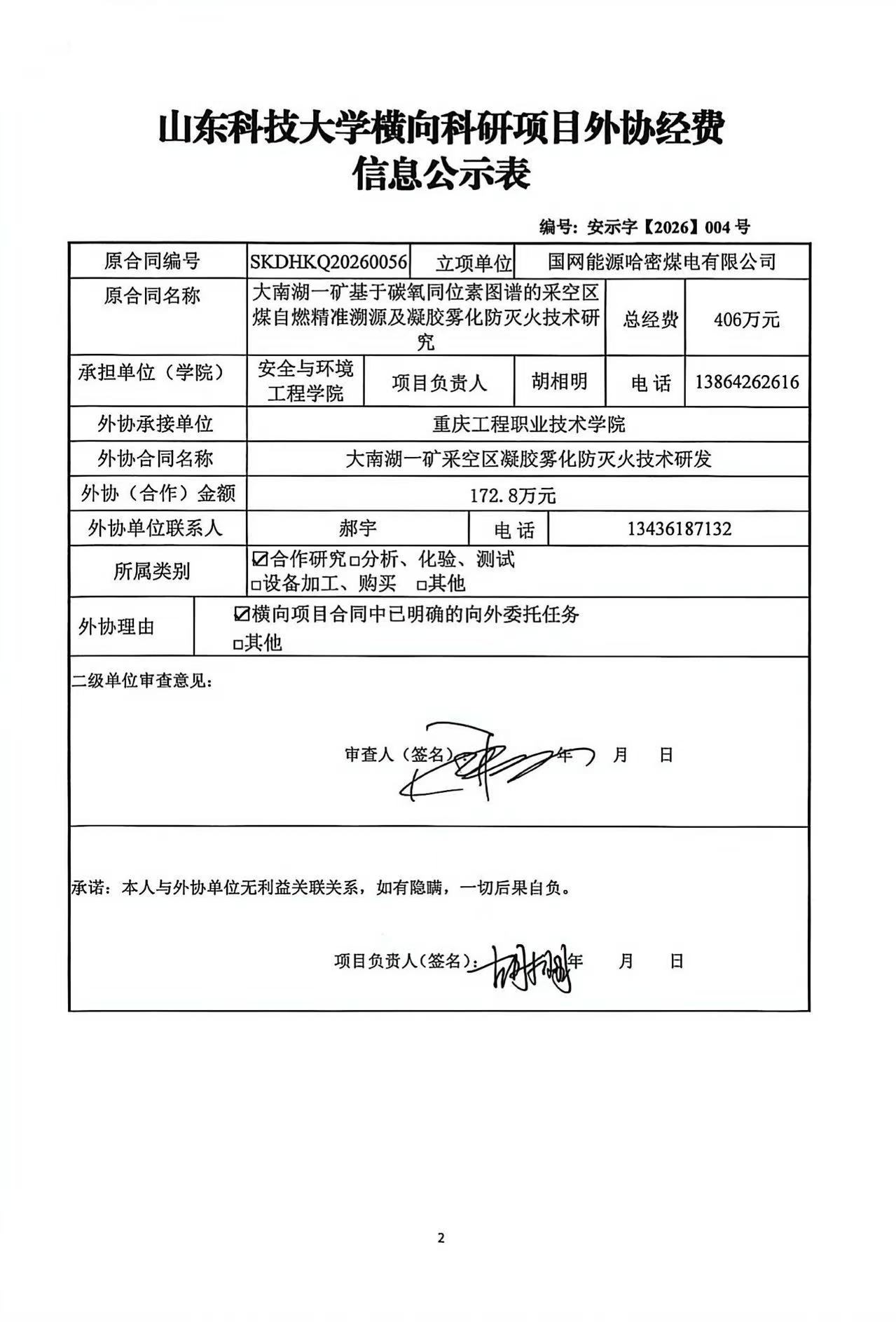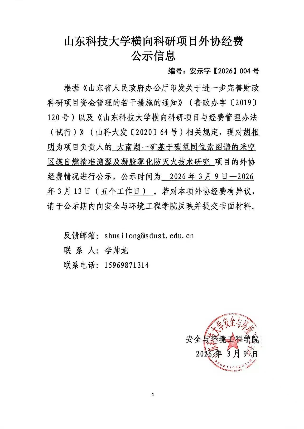 山东科技大学横向科研项目外协经费公示信息
