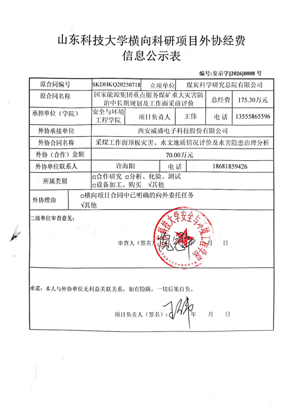根据《山东省人民政府办公厅印发关于进一步完善财政科研项目资金管理的若干措施的通知》(鲁政办字〔2019〕120号)以及《山东科技大学横向科研项目与经费管理办法(试行)》(山科大发〔2020〕64号)相关规定,现对 王伟 为项目负责人的 国家能源集团重点服务煤矿重大灾害防治中长期规划及工作面采前评价 项目的外协经费情况进行公示,公示时间为 2026年4月14日-2025年4月21日 。若对本项外协经费有异议,请于公示期内向星际娱乐城 反映并提交书面材料。