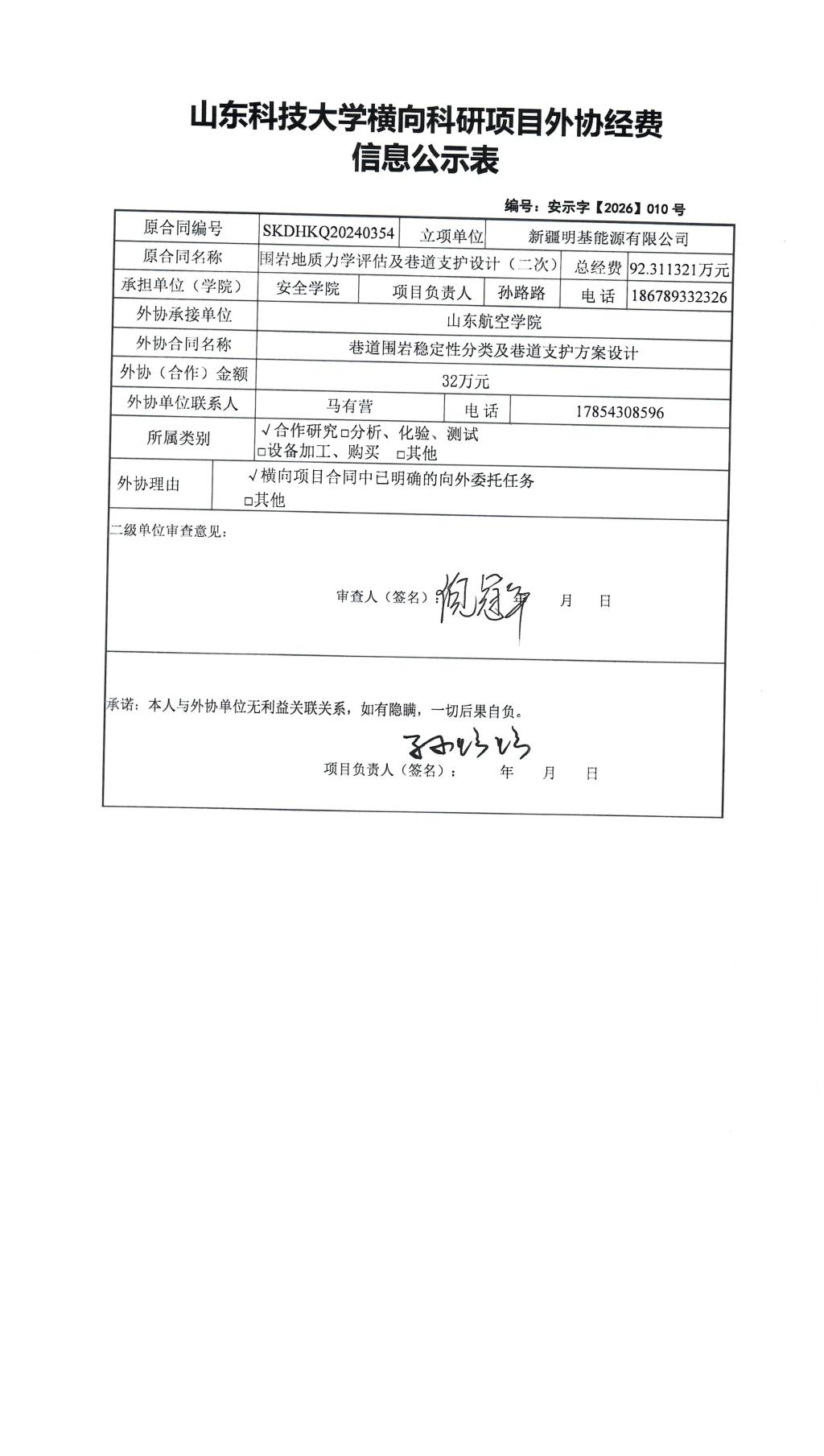 根据《山东省人民政府办公厅印发关于进一步完善财政科研项目资金管理的若干措施的通知》(鲁政办字〔2019〕120号)以及《山东科技大学横向科研项目与经费管理办法(试行)》(山科大发〔2020〕64号)相关规定,现对孙路路为项目负责人的 围岩地质力学评估及巷道支护设计(二次) 项目的外协经费情况进行公示,公示时间为 2026年04月20日至2026年04月24号(五个工作日) 。若对本项外协经费有异议,请于公示期内向星际娱乐城 反映并提交书面材料。