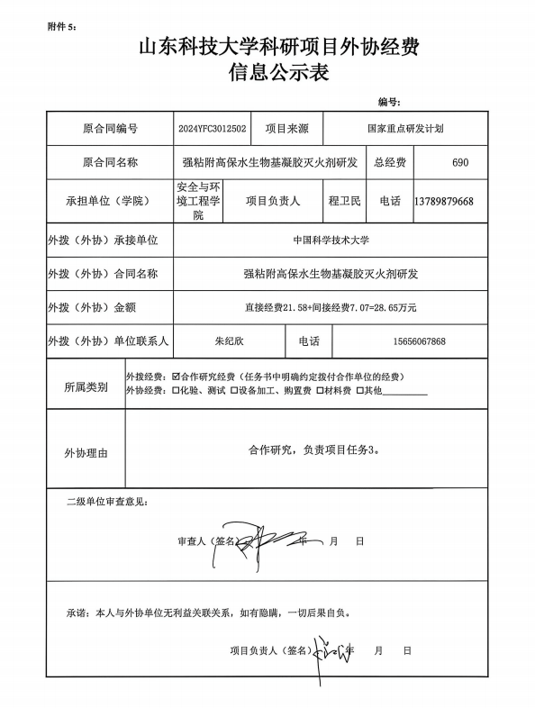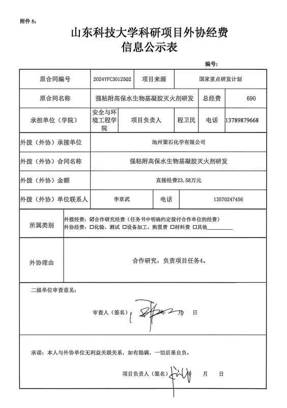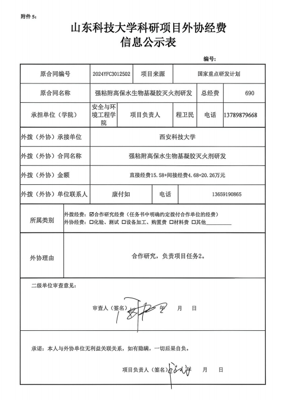 根据《山东省人民政府办公厅印发关于进一步完善财政科研项目资金管理的若干措施的通知》(鲁政办字〔2019〕120号)以及《山东科技大学科研项目与经费管理办法(试行)》(山科大发〔2020〕64号)相关规定,现对程卫民为项目负责人的强粘附高保水生物基凝胶灭火剂研发项目的外协经费情况进行公示,公示时间为 2026年4月20日~2026年4月24日(公示时间不少于5个工作日)。若对本项外协经费有异议,请于公示期内向星际娱乐城 或科技处反映并提交书面材料。