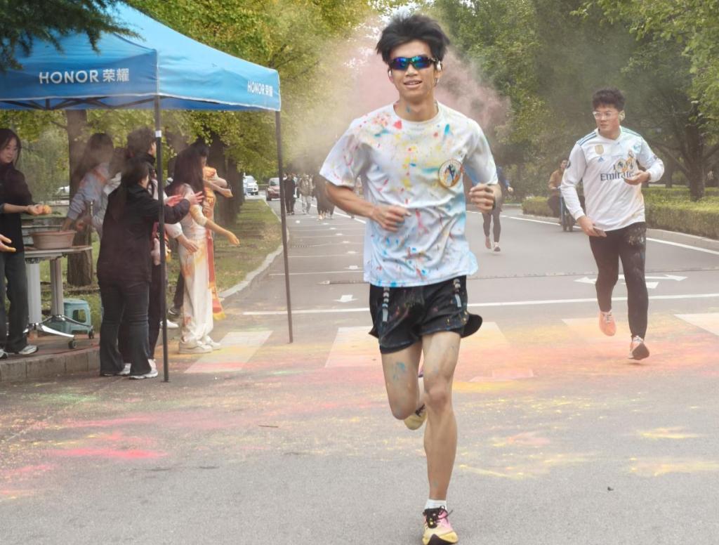 发令枪响,参赛选手精神饱满、步伐矫健,在志愿者引导下有序出发。沿途彩粉飞扬,如绚烂云霞,伴跑青春征程。同学们在奔跑中展现朝气,在阳光下绽放笑容,以昂扬姿态奔向终点,生动诠释了青春最美的风采。跑道终点,彩粉互动环节将现场气氛推向高潮,同学们相互泼洒的彩色“快乐”映衬在一张张“花脸”上,让此次活动成为这个秋日最生动的青春注脚。参与活动的学生纷纷表示,这次校园跑不仅是一场体育赛事,更是一次难忘的青春体验。“整个过程虽然累,但特别释放压力,也结识了很多新朋友。在彩粉中奔跑,在欢笑中前行,让我真切感受到了运动的快乐和集体的温暖。”校马拉松协会成员崔柏闻说道。